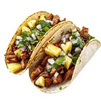 Taco Al Pastor Carne de Porco - Sweetchili com abacaxi assado, cebola, coentro e toque de limão. Molho picante opcional |