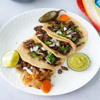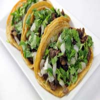 Taco de Bisteck Contra Filet ao molho "pico de gallo" (cebola, tomate, coentro e limão), jalapeños (opcional) e molho picante (opcional), ou com molho "El Ranchito" - tomate, cebola, pimentão e pimenta na brasa picados e envolvidos no alho, coentro e limão. |
